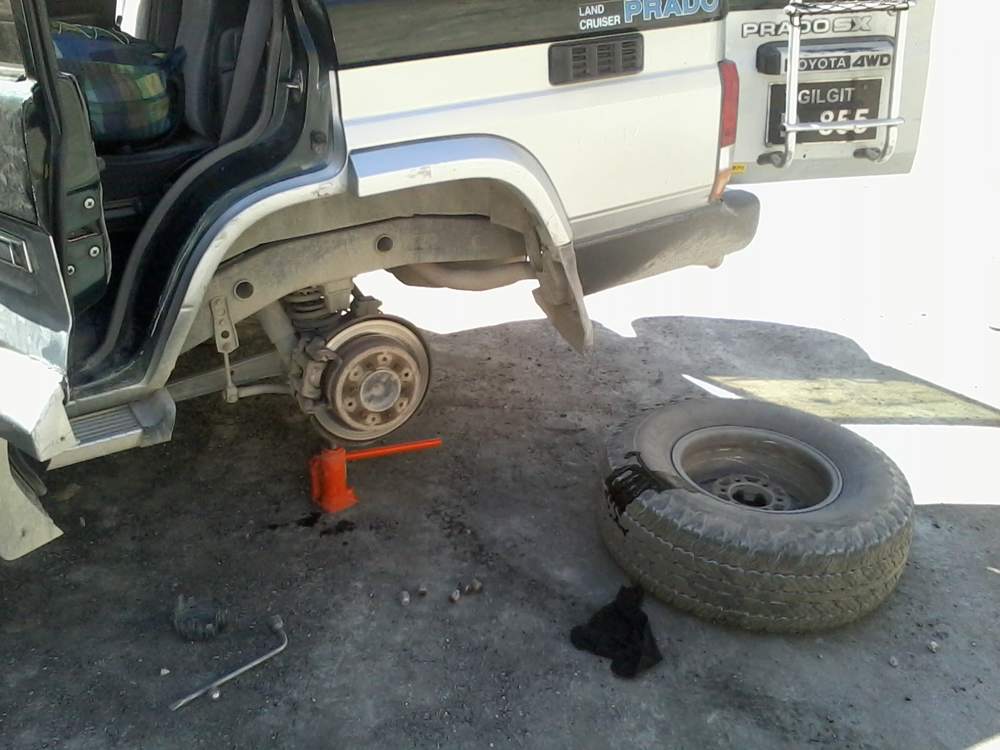 We all piled out to see the tyre was completely disintegrated. They had no jack, so they put a large oval rock under the