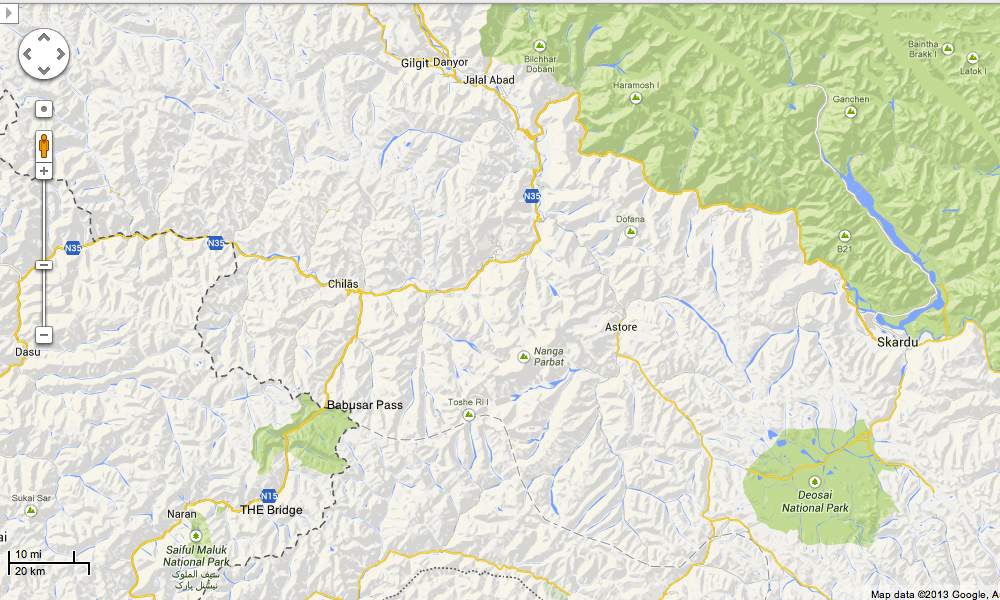 Going north up the N15 (Kaghan Valley), through Naran, find THE Bridge, cross the Babusar Pass, join N35 (KKH, Karakorum Highway)