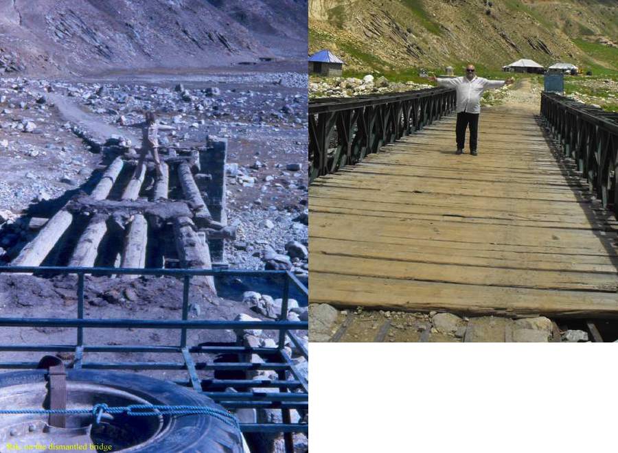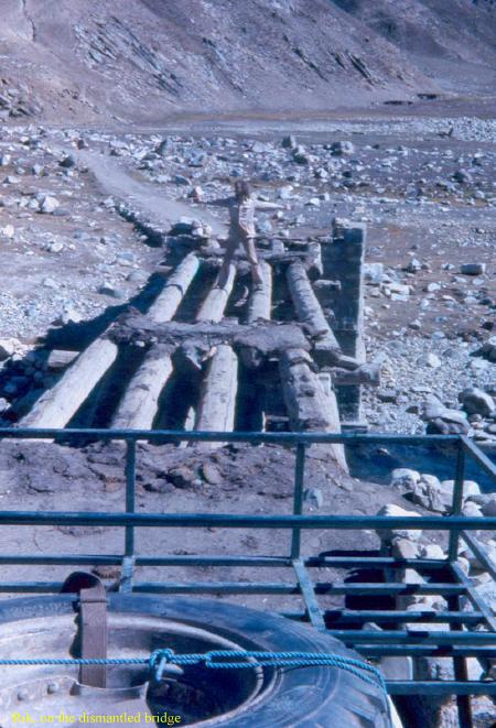 We were late leaving and we didn't know that as winter approached, many of the old wooden bridges would be half dismantled to stop people using them and getting too far north. We soon discovered this. We met our first partially dismantled bridge, but managed to get over it. We met a second, and had to ford the river it crossed, but when we met the third bridge, it stumped us. At an altitude of 10,000 feet we tried to build a pathway for our Landrover so we could reach the river and ford it as we had done previously. We quickly exhausted ourselves, and abandonned the attempt. We named this "The Bridge that Stopped Us", which I subsequently called "THE Bridge".