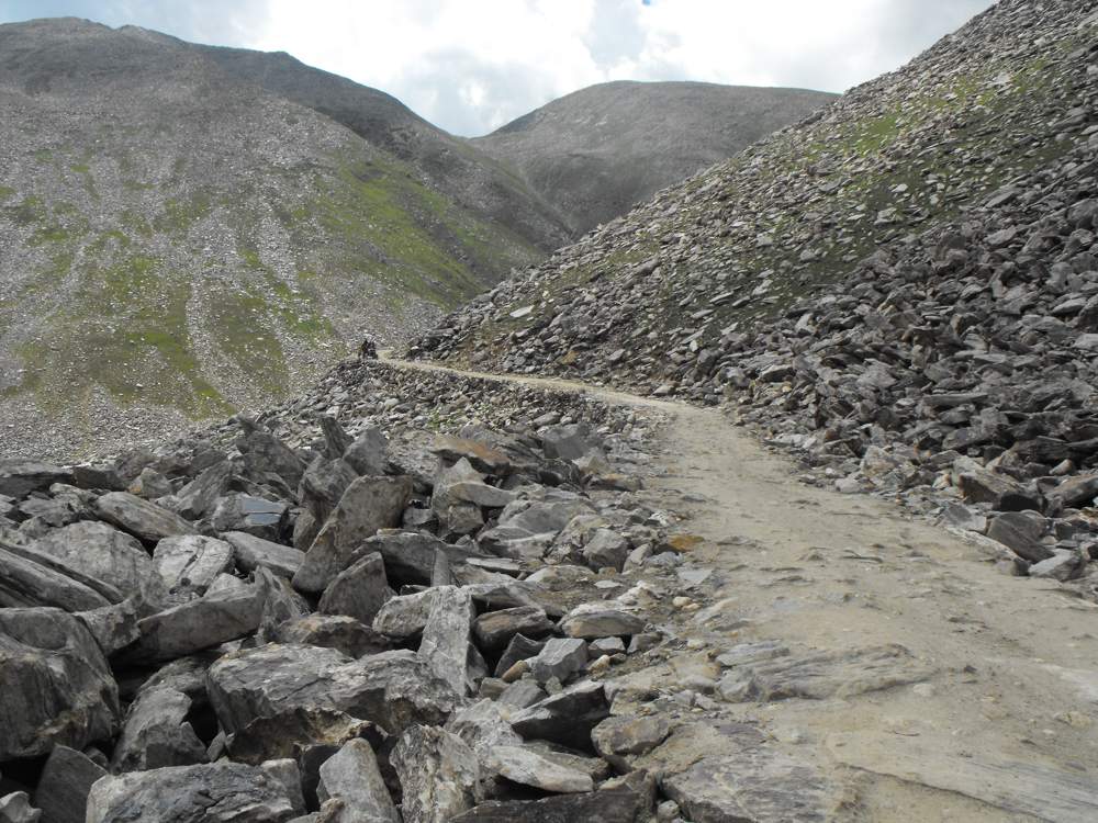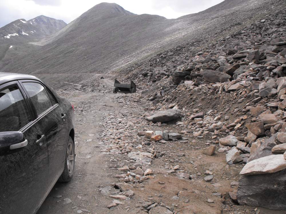 A while later "A" advised me we were at the Botoga Pass. We stopped for my obligatory photos, and GPS reading, and I marvelled as we looked down on snow capped mountains in the distance, but below us. We were at 14,184 feet, and some 30km from the turnoff. Well, I could see the track snaking round the mountain, and it was descending, and my spirits lifted, we can't be too far away now. Oh Rik, when will you learn?